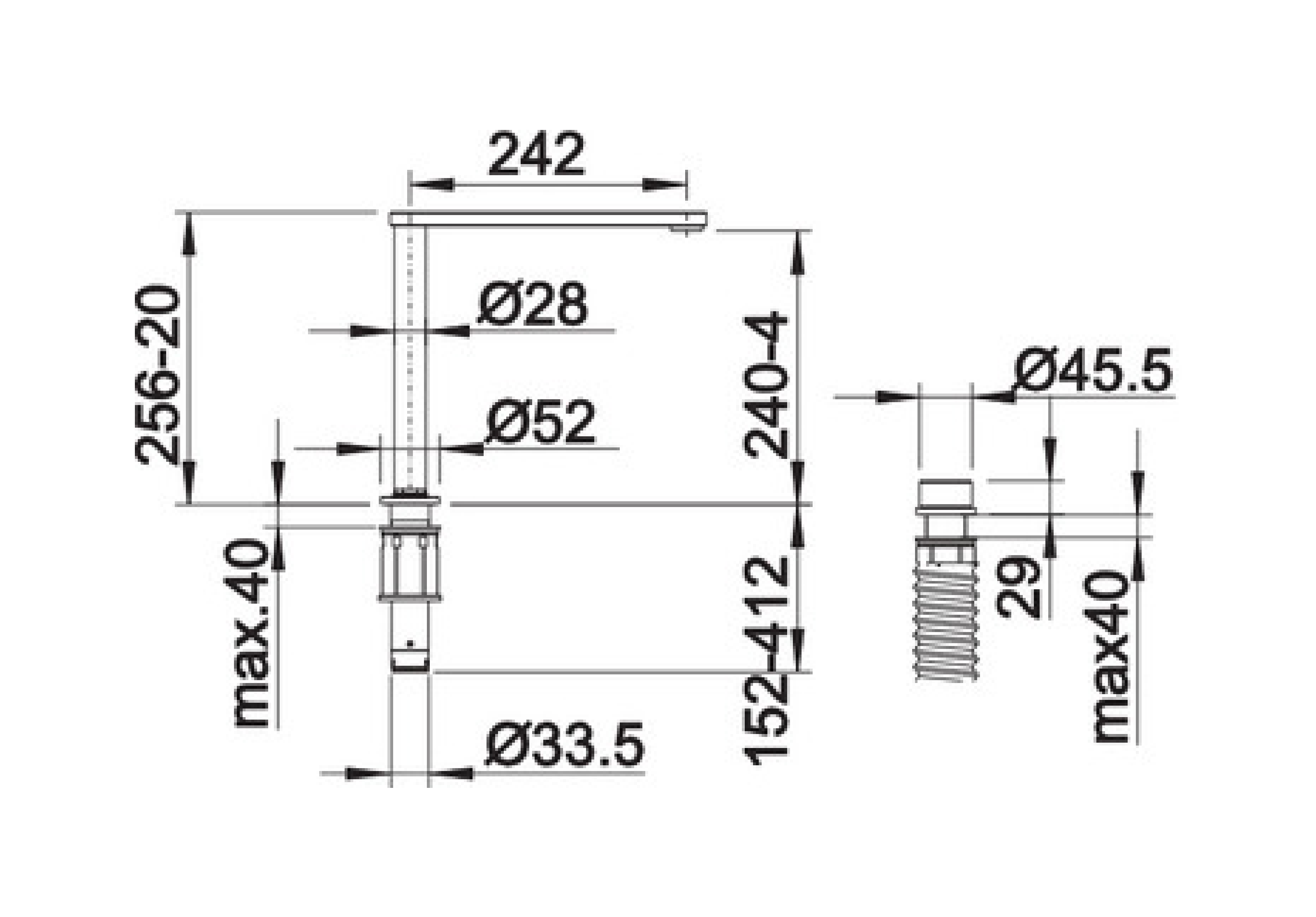 If you are looking for a retractable pre-window fitting, BLANCO ELOSCOPE-F offers the perfect solution. If required, the right-angled spout can easily be lowered into the sink – thus ensuring a tidy feeling in your kitchen. Especially practical for compact conditions: It is only 3 cm minimum distance from the sink to the window sash needed. In practice, BLANCO ELOSCOPE-F impresses with its high spout, which facilitates the cleaning and filling of large pots and vases. The clear, uncompromising design of the mixer creates a real eye-catcher in your kitchen. Please note: BLANCO ELOSCOPE-F requires a total of two mounting holes: one for the valve and one for the control lever.